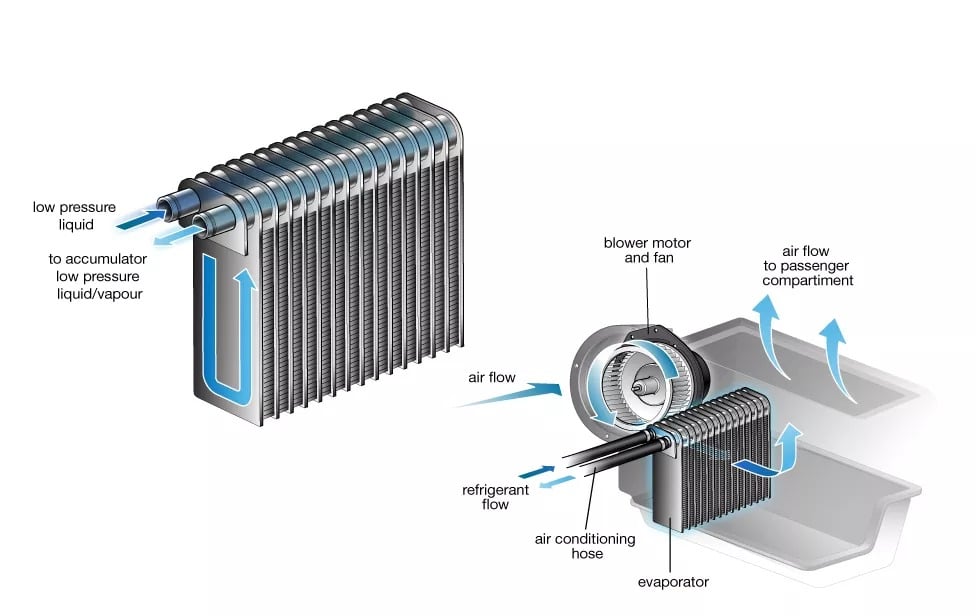 Hệ thống điều hòa không khí được thiết kế để loại bỏ nhiệt từ không khí. Công việc của thiết bị bay hơi là khai thác chất làm lạnh lạnh ở trạng thái lỏng. Khi không khí nóng ấm đi dọc theo các đường ống dàn lạnh, nó thu nhiệt từ không khí và làm mát không khí. Không khí lạnh sau đó được lưu thông vào cabin.