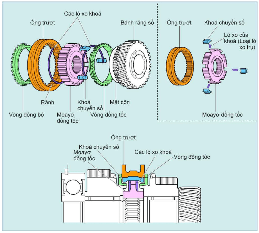Nằm giữa hai bánh răng khác nhau, có một moay ơ đồng tốc (xem hình trên) gắn kết chúng. Ví dụ, moay ơ giữa bánh răng thứ nhất và bánh răng thứ hai, và moay ơ giữa bánh răng thứ ba và bánh răng thứ tư…