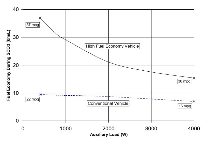 Công suất cần thiết để vận hành máy nén điều hòa không khí trên xe là rất đáng kể – nó có thể lớn hơn công suất động cơ cần thiết để di chuyển một chiếc xe cỡ trung ở tốc độ không đổi 56 km/h (35 dặm/giờ). Mức tải 400 W trên động cơ thông thường có thể làm giảm mức tiết kiệm nhiên liệu khoảng 0,4 km/L (1 mpg). Với một chiếc SUV, công suất tiêu thụ của điều hòa có thể lên đến 7 kW (9.3HP), do đó động cơ đốt trong sẽ cần trích ra một công suất để vận hành máy nén. Ngoài ra nó còn cần tới điện để vận hành quạt thông gió, các hệ thống điều khiển, rơ le từ, do đó động cơ ô tô sẽ cần công suất quay máy nén, công suất quay máy phát để có thể vận hành hệ thống.