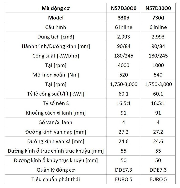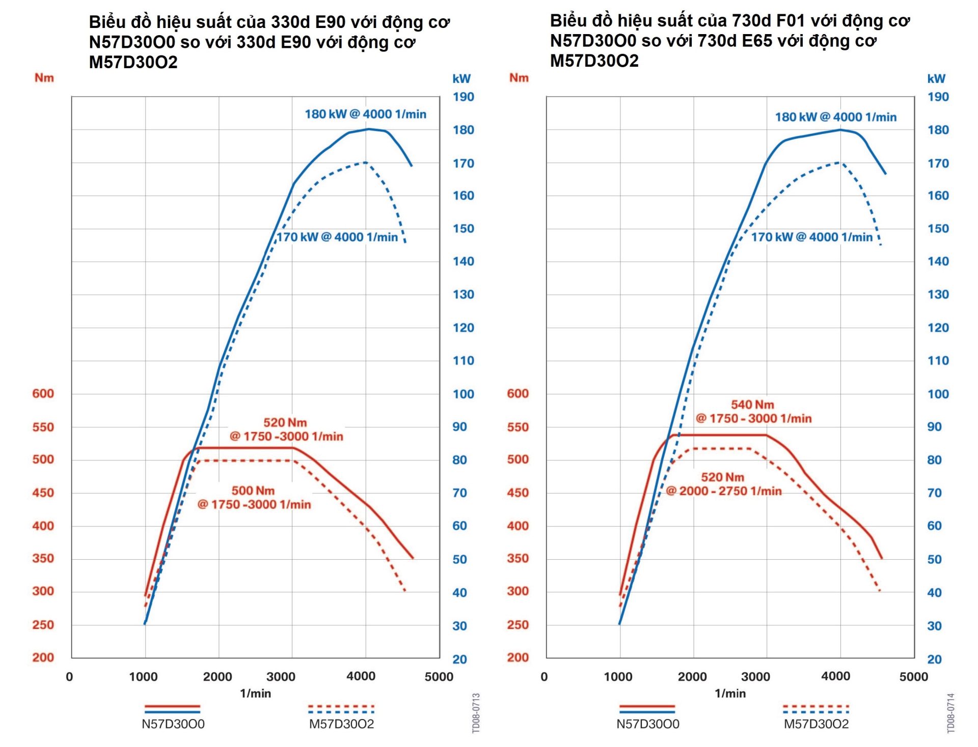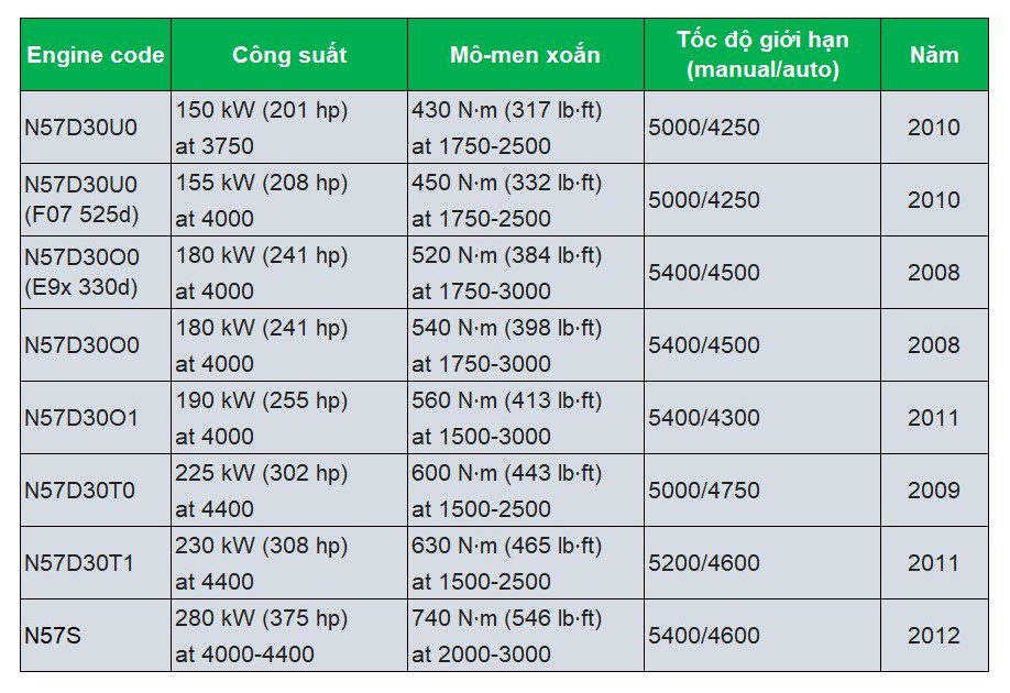 N57D30Ox có áp suất phun nhiên liệu 1800 bar, N57D30Tx có áp suất phun nhiên liệu 2000 bar.