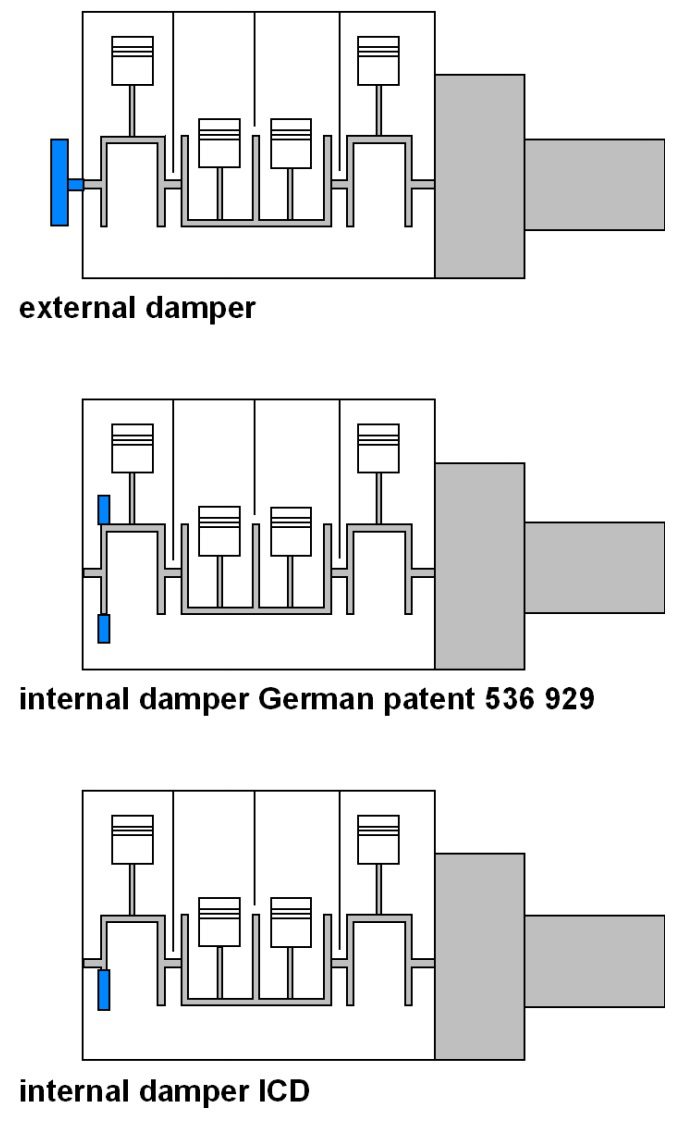 Đã có bằng sáng chế cho bộ giảm chấn kết hợp lò xo đặt trực tiếp vào cacte ngay từ những năm 1930. Trong các bằng sáng chế này, bộ giảm chấn hình khuyên được đặt trên đường kính ngoài hiện có của má khuỷu (hình 4 ở giữa) hoặc các cơ cấu khá phức tạp được tích hợp vào má khuỷu. Không gian khoang động cơ bổ sung cần thiết cho việc này và các điều kiện sử dụng phức tạp trong cacte đã ngăn cản việc thực hiện những ý tưởng đó và cho đến nay đã ngăn cản việc sử dụng bộ giảm chấn bằng cao su hoặc độ nhớt trong cacte – ít nhất là trong động cơ ô tô khách.