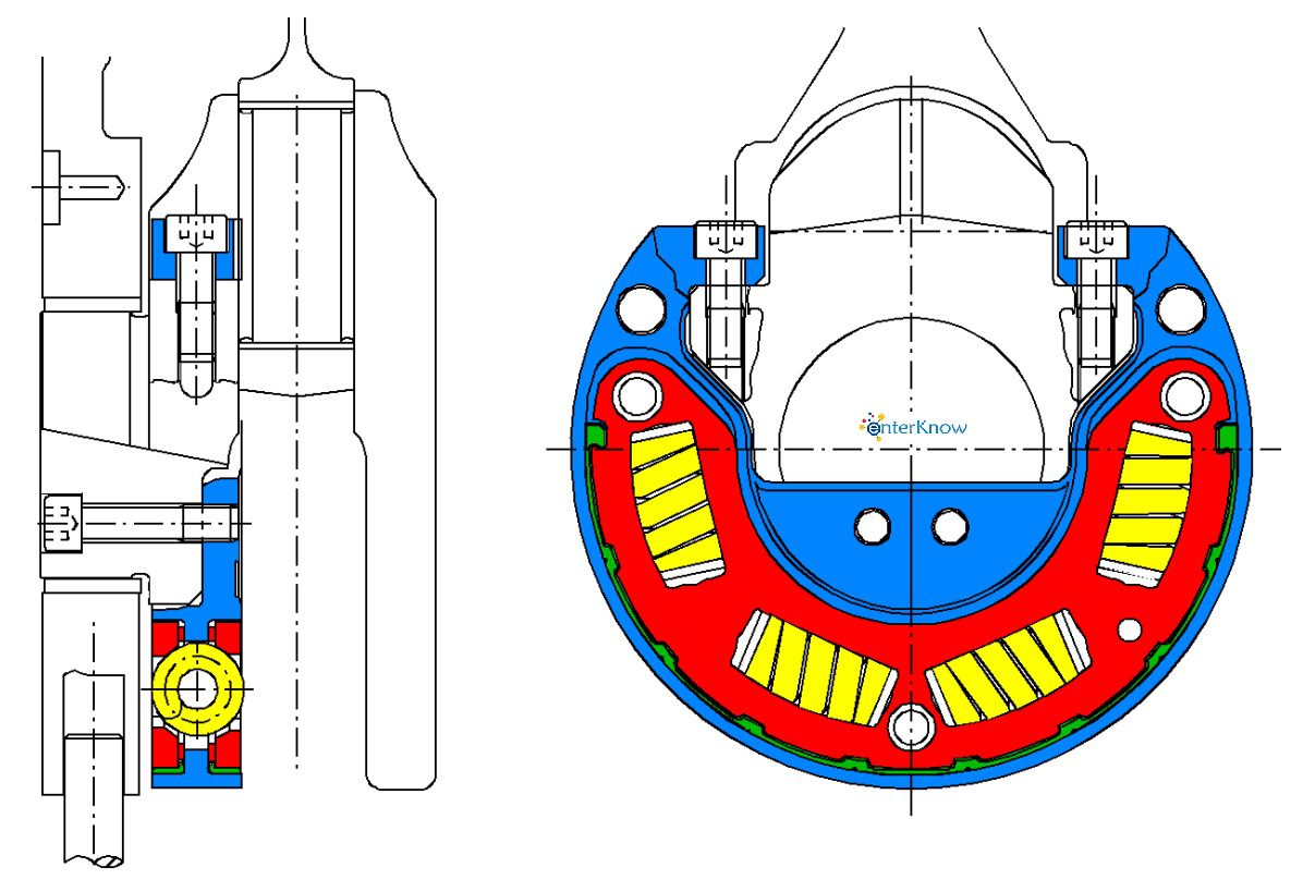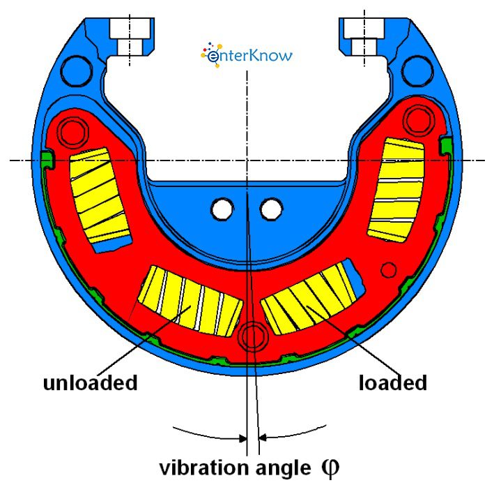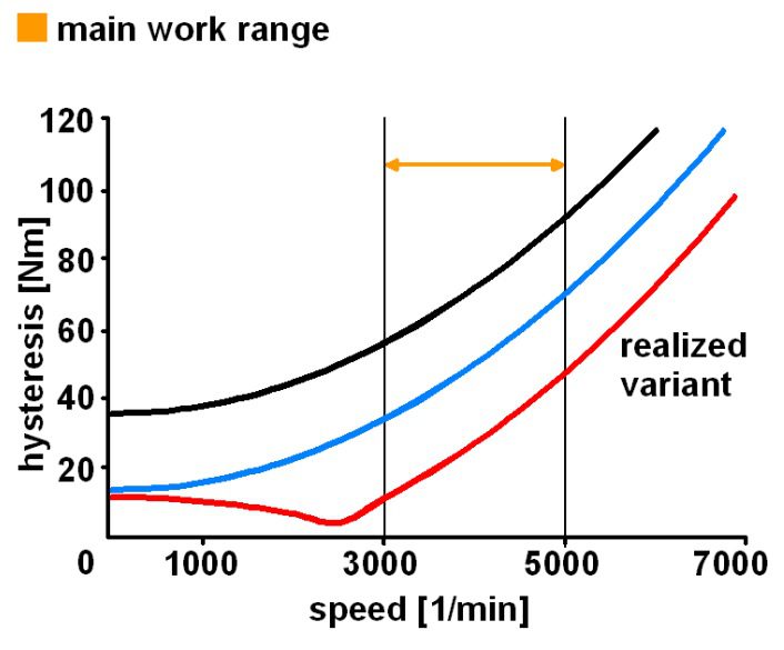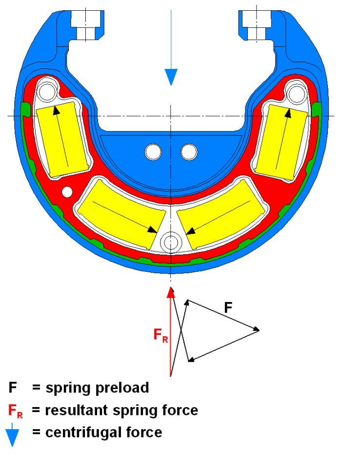 Các lực tác dụng lên ổ trượt chắc chắn phụ thuộc vào tốc độ do hình dạng không kín của bộ giảm chấn. Lò xo cuộn có thể được định vị sao cho lực lò xo tổng hợp có thể giảm hoặc tăng lực chịu lực theo tốc độ để đạt được ma sát giảm chấn tối ưu tùy thuộc vào ứng dụng (hình 9). Ưu điểm của giải pháp này là phần lớn hệ thống giảm chấn không phụ thuộc vào lực của phần tử lò xo hướng trục cũng như hiệu suất mài mòn và cài đặt của nó trong suốt thời gian sử dụng. Lực ly tâm của khối lượng quay của bộ giảm chấn để tạo ra lực cản ma sát không đổi.