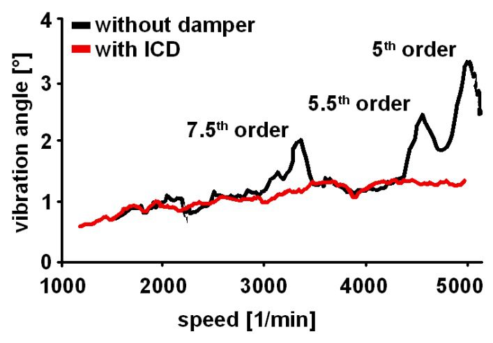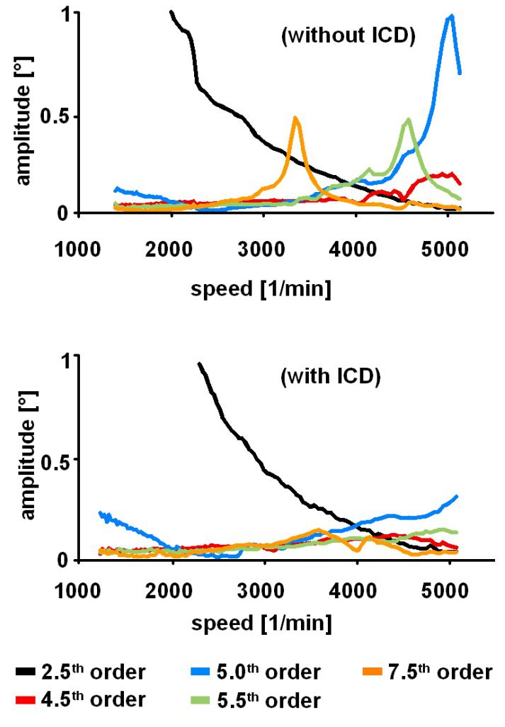 Việc giảm góc rung của trục khuỷu về mặt lý thuyết được tính toán trong mô hình mô phỏng khi sử dụng ICD được xác nhận bằng các phép đo trên động cơ thực (hình 12). Việc giảm tải trọng lên trục khuỷu cũng được thể hiện trong phần phân tích thứ tự. Các thứ tự chính (5, 5,5 và 7,5) giảm đáng kể (hình 13).