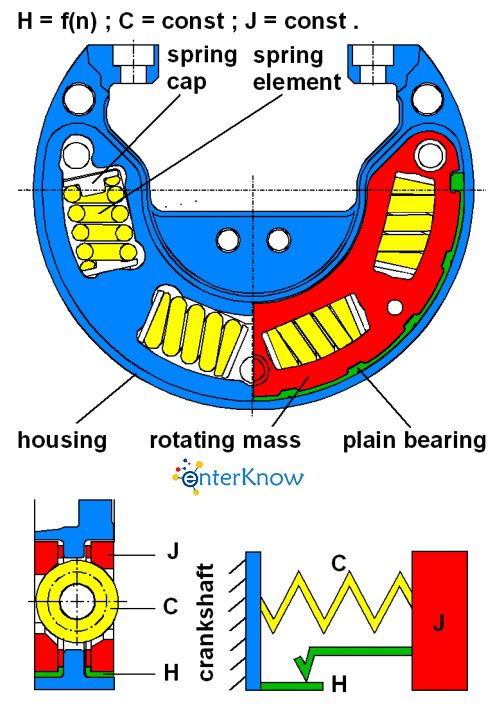 Bộ giảm chấn có khớp nối lò xo chủ yếu bao gồm một khối lượng quay với mômen quán tính xác định (sau đây gọi là quán tính), được nối với trục khuỷu thông qua các phần tử lò xo. Tần số riêng của bộ giảm chấn, phải được điều chỉnh theo tần số riêng của trục khuỷu, là kết quả của độ cứng lò xo xoắn của các phần tử lò xo và quán tính của khối lượng quay.