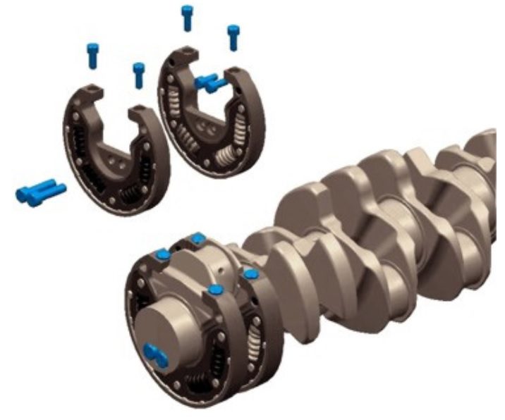 Bộ giảm chấn được đặt trên má khuỷu đầu tiên và được cố định vào trục khuỷu bằng hai bu lông hướng tâm và tùy thuộc vào ứng dụng, một hoặc hai bu lông hướng trục, sau đó được lắp bằng bu lông này vào khối động cơ (hình 6). Đồng thời, giảm chấn cũng thay thế một trong các đối trọng cho trục khuỷu.