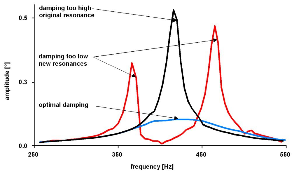 Đặc tính rung động của trục khuỷu được thay đổi nhờ bộ giảm chấn. Hệ thống có thêm một bậc tự do – ở mức giảm chấn bằng 0, cộng hưởng ban đầu biến mất hoàn toàn – tuy nhiên tạo ra hai cộng hưởng mới. Ở mức giảm chấn rất cao, không có tác dụng. Bộ giảm chấn gần như cứng nhắc, dẫn đến tần số và biên độ gần giống như sự cộng hưởng trục khuỷu ban đầu. Nếu hệ thống giảm chấn được thiết kế chính xác thì cả cộng hưởng mới lẫn cộng hưởng ban đầu đều không bị gián đoạn.