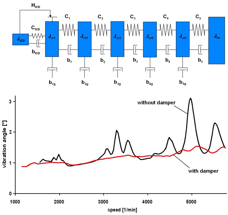 Hành vi rung của trục khuỷu được tái tạo trong các mô phỏng này. Hình 11 thể hiện mô hình rung của trục khuỷu từ động cơ diesel đã đề cập trước đó và so sánh góc rung của trục khuỷu được tính toán khi không có bộ giảm chấn so với việc sử dụng ICD do LuK phát triển. Đỉnh cộng hưởng ở góc rung trục khuỷu giảm đi đáng kể.