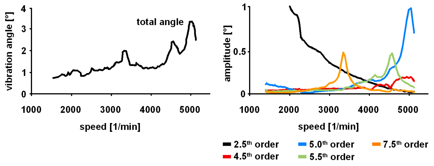 Hình trên cho thấy phép đo trục khuỷu của động cơ diesel không có bộ giảm chấn. Hình 2 minh họa thể hiện góc dao động giữa bánh đà và đầu kia của trục khuỷu ở xi lanh 1 cũng như phân tích thứ tự các biên độ dao động của đầu tự do của trục khuỷu theo tốc độ trung bình. Góc dao động tổng cộng giữa đầu trục khuỷu và bánh đà ở các tốc độ cộng hưởng khác nhau đôi khi lớn hơn hai lần giá trị cho phép. Bằng cách quan sát các thứ tự riêng lẻ, có thể thấy rõ rằng các giá trị tối đa cho góc rung của động cơ này chủ yếu đạt được ở 5, 5,5 và 7,5. Chúng kích thích tần số tự nhiên đầu tiên của trục khuỷu, xấp xỉ 420 Hertz.