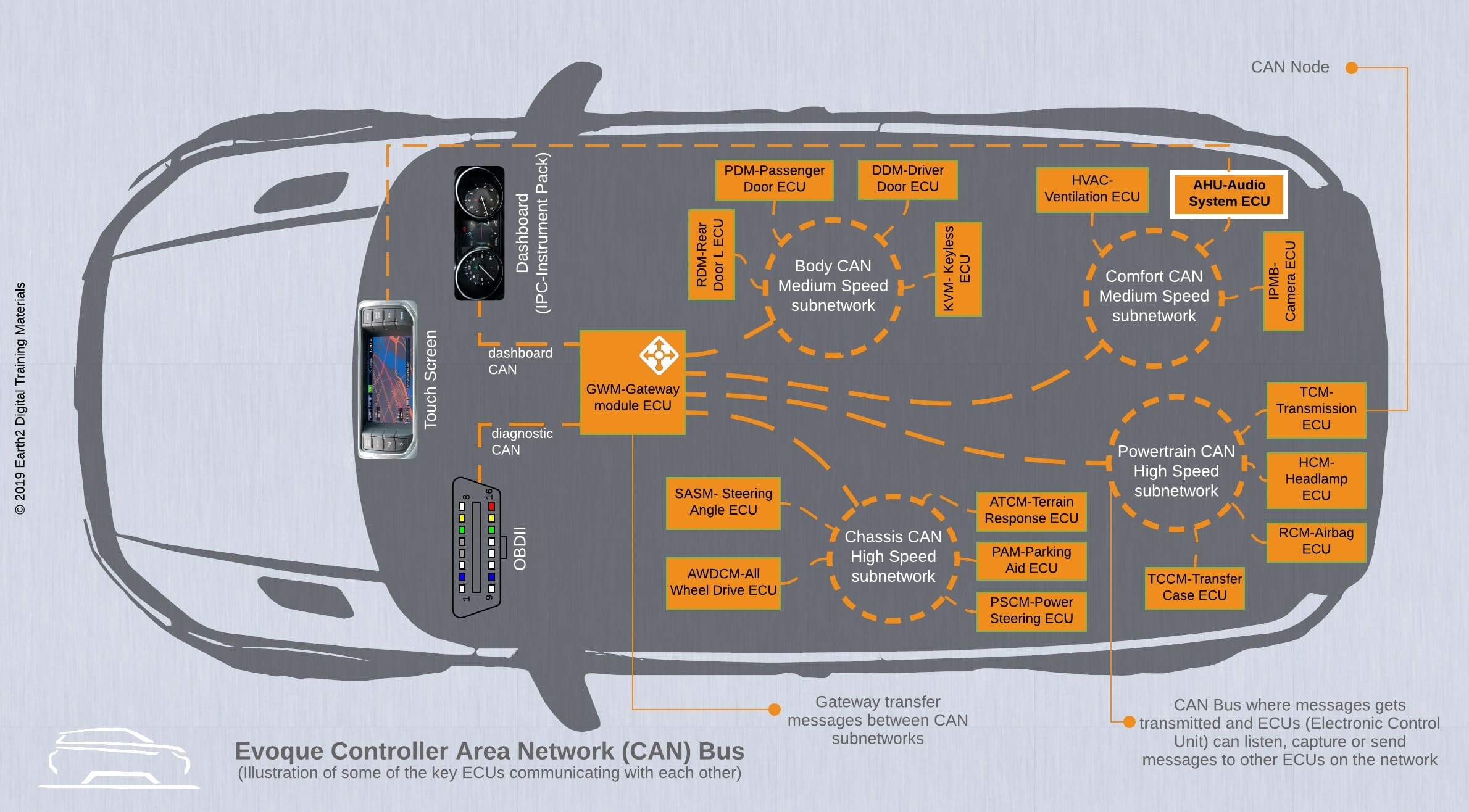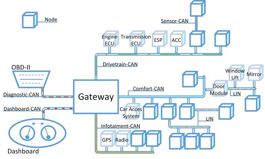 Controller Area network (CAN bus) – Mạng khu vực điều khiển là một tiêu chuẩn bus xe được thiết kế để cho phép giao tiếp hiệu quả chủ yếu giữa các bộ điều khiển điện tử (ECU). Ban đầu được phát triển để giảm độ phức tạp và chi phí của hệ thống dây điện trong ô tô thông qua ghép kênh, giao thức bus CAN kể từ đó đã được áp dụng trong nhiều bối cảnh khác nhau. Giao thức hướng tin nhắn dựa trên phát sóng này đảm bảo tính toàn vẹn và ưu tiên của dữ liệu thông qua một quy trình gọi là trọng tài, cho phép thiết bị có mức ưu tiên cao nhất tiếp tục truyền nếu nhiều thiết bị cố gắng gửi dữ liệu cùng lúc, trong khi những thiết bị khác dừng lại. Độ tin cậy của nó được tăng cường bằng tín hiệu vi sai, giúp giảm nhiễu điện. Các phiên bản phổ biến của giao thức CAN bao gồm CAN 2.0, CAN FD và CAN XL, có khả năng tốc độ dữ liệu và kích thước tải trọng dữ liệu tối đa khác nhau.