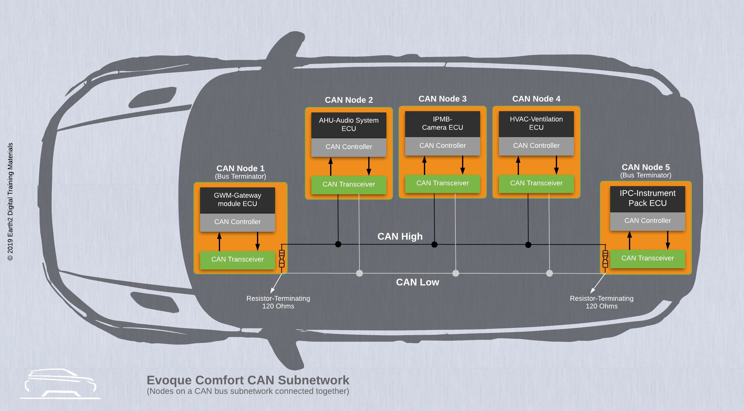 Bộ vi điều khiển máy chủ, bộ thu phát CAN và bộ điều khiển CAN được bao gồm trong một nút CAN. Thiết bị ngoại vi bên trong của vi điều khiển thường là bộ điều khiển CAN. Điện trở kết thúc đóng vai trò thiết yếu trong việc hoàn thiện mạch giữa hai đường tín hiệu và giảm thiểu phản xạ tiềm tàng trên đường dây. Điện áp bus tiêu chuẩn thường hoạt động ở mức 5V và các tín hiệu được tổ chức thành các cặp xoắn có hoặc không có vỏ bọc.