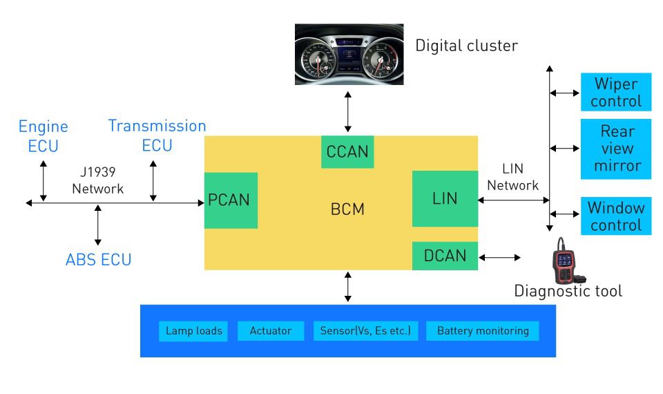 Trên xe, BCM thường xuyên giao tiếp với một số module khác, cần khả năng giao tiếp mạnh. Đối với nhiều cảm biến và bộ truyền động liên quan đến chức năng thân xe, chúng thường hoạt động như một trung tâm.
