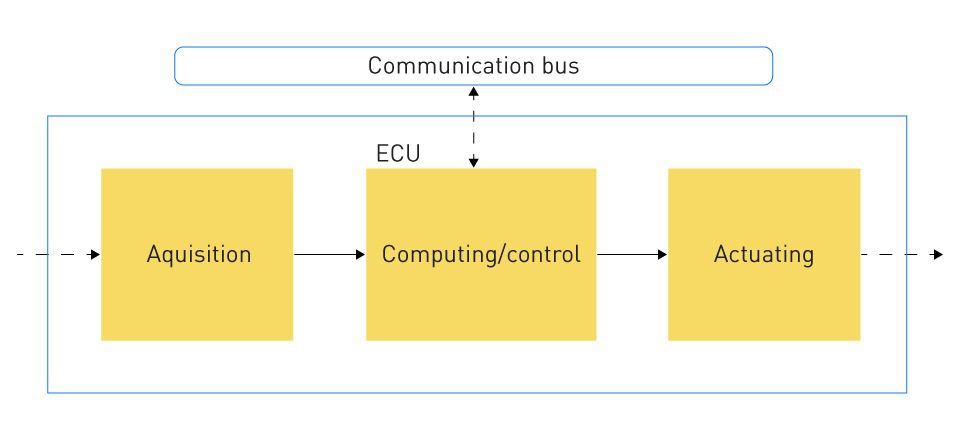 Giao diện của các cảm biến được liên kết với ECU được gọi là “thu nhận” (acquisition). Nó có mạch điều hòa kỹ thuật số hoặc analog. Bộ vi điều khiển, bao gồm các chức năng tính toán và điều khiển, thực hiện các phép toán logic số học cùng với các thành phần hỗ trợ của nó. Trong mạch, bus truyền thông là nhiều loại kết nối khác nhau (LIN, FlexRay, CAN, Ethernet, v.v.) với các ECU khác. Thuật ngữ “kích hoạt” (actuating) dùng để chỉ các công tắc chung trong mô-đun chịu trách nhiệm quản lý nhiều loại tải điện, bao gồm động cơ, máy sưởi, cuộn dây điện từ, v.v.