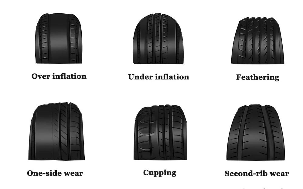 Căn chỉnh hệ thống treo không đúng, trong trường hợp này, đó là một ví dụ về cái được gọi là “độ chụm dương” hoặc lốp xe nghiêng vào bên trong xe hơn là bên ngoài. Nếu vết mòn ở bên ngoài lốp, đó là “độ chụm âm”. Trong cả hai trường hợp, đây là một dấu hiệu cảnh báo rằng bạn nên kiểm tra các thành phần hệ thống treo của mình; vì có khả năng khớp CV hoặc thanh giằng bị hỏng, mòn hoặc có thể bị gãy.