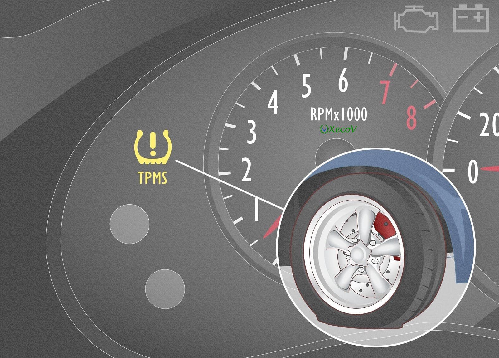 Tire pressure monitoring system (TPMS) – Hệ thống giám sát áp suất lốp giám sát áp suất không khí trong mỗi lốp xe của bạn. Nếu một hoặc nhiều trong số chúng rơi xuống mức không an toàn khi lái xe, đèn cảnh báo TPMS trên bảng điều khiển của bạn sẽ sáng. Đèn thường có màu vàng và hiển thị hình ảnh giống như hình cắt của lốp xe với dấu chấm than bên trong.