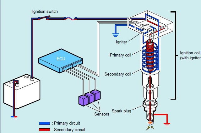 - Khi công tắc đánh lửa được bật ON, dòng điện từ ắc quy bắt đầu chạy qua công tắc đánh lửa đến bộ điều khiển điện tử (tiếp tục xử lý dữ liệu và tính toán thời gian) của xe được kết nối với cụm mô-đun đánh lửa và cuộn dây (tạo và ngắt mạch).