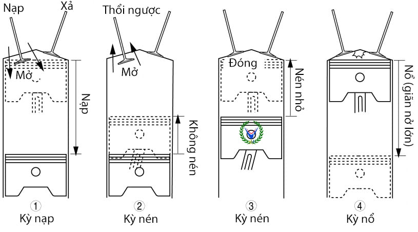 Động cơ đốt trong kiểu pittông truyền thống sử dụng bốn kỳ, trong đó hai kỳ có thể được coi là công suất cao: kỳ nén (dòng công suất cao từ trục khuỷu đến khí nạp) và kỳ công suất (dòng công suất cao từ khí đốt đến trục khuỷu).