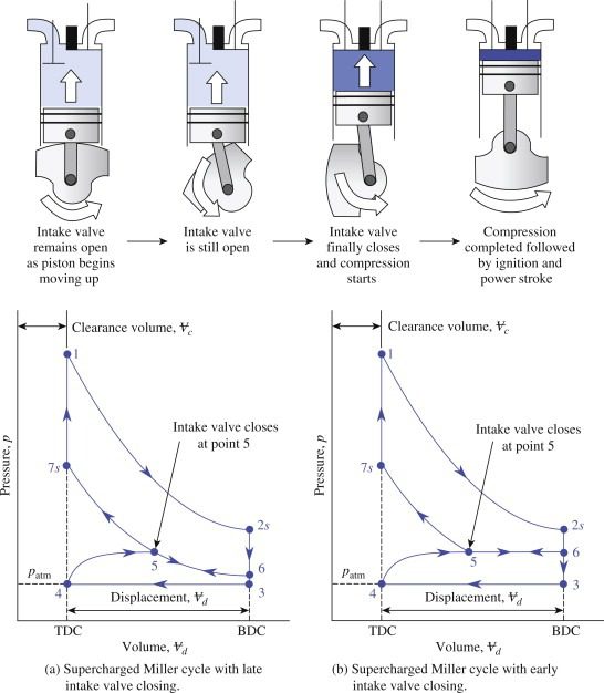 Trong chu trình Miller, van nạp được mở lâu hơn so với động cơ chu trình Otto. Trong thực tế, hành trình nén là hai chu kỳ riêng biệt: phần đầu khi van nạp mở và phần cuối cùng khi van nạp đóng. Hành trình nén hai giai đoạn này tạo ra cái gọi là hành trình “thứ năm” mà chu trình Miller đưa ra. Khi pít-tông ban đầu di chuyển lên trên trong hành trình nén truyền thống, khí nạp sẽ bị đẩy ra ngoài một phần qua van nạp vẫn mở. Thông thường, việc mất khí nạp này sẽ dẫn đến mất công suất. Tuy nhiên, trong chu trình Miller, điều này được bù đắp bằng việc sử dụng bộ tăng áp. Bộ siêu tăng áp thường phải là loại chuyển vị dương (Roots hoặc trục vít) do khả năng tạo ra lực tăng áp ở tốc độ động cơ tương đối thấp. Nếu không, năng lượng ở tốc độ thấp sẽ bị ảnh hưởng. Ngoài ra, có thể sử dụng turbo tăng áp để đạt hiệu quả cao hơn nếu không cần vận hành ở tốc độ thấp hoặc bổ sung động cơ điện.