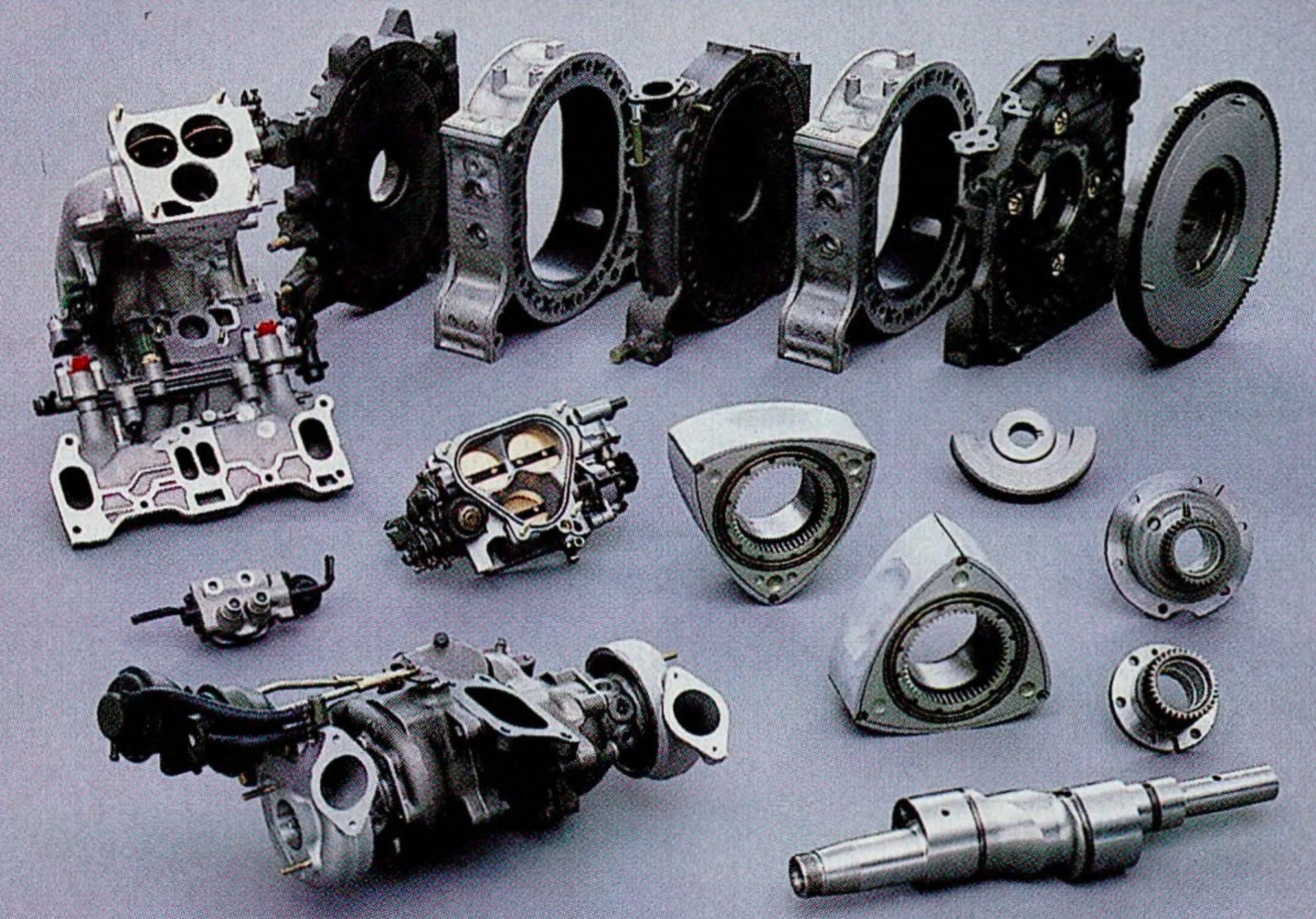 Động cơ quay Wankel lưu ý rằng NSU đã cấp 15 giấy phép cho công nghệ của mình vào năm 1966, một liên doanh sinh lợi theo đúng nghĩa của nó. Sự nhỏ gọn của động cơ quay là một lợi ích to lớn. Cuốn sách của Yamamoto có một hình minh họa tuyệt vời cho thấy động cơ twin-rotor có chiều cao và chiều dài ngắn hơn nhiều so với cả động cơ bốn xi-lanh thẳng hàng và sáu xi-lanh. Một hình ảnh khác cho thấy không gian chứa đựng các bộ phận chính của một rôto đôi và sáu cam thẳng hàng, và trục quay có khối lượng chưa đến một phần ba, trừ đi các chốt. Một động cơ quay cũng dễ dàng được mô-đun hóa — bạn có thể tiếp tục thêm các động cơ quay vào không gian bố trí động cơ của mình. Mặc dù động cơ bốn rô-to là tương đối dài.