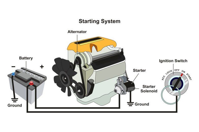 Thiết kế: Một cuộn dây điện từ (solenoid), bánh răng, động cơ, bánh răng dẫn động và cơ cấu truyền động có trong bộ khởi động. Solenoid kết nối bánh răng với bánh đà và động cơ sẽ quay động cơ khi bật công tắc đánh lửa.