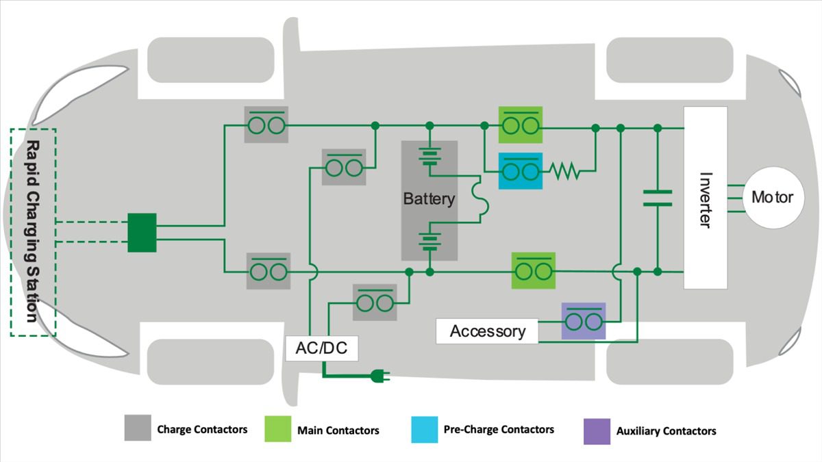 Trường hợp sử dụng: Công tắc tơ đóng vai trò thường xuyên trong xe điện, tạo điều kiện thuận lợi cho việc kết nối hoặc ngắt kết nối an toàn của bộ pin để đảm bảo điều kiện vận hành an toàn. Công tắc tơ tìm thấy một ứng dụng khác trong hệ thống sạc điện áp cao trên bo mạch, dùng để liên kết thiết bị sạc EV với bộ sạc trên bo mạch.