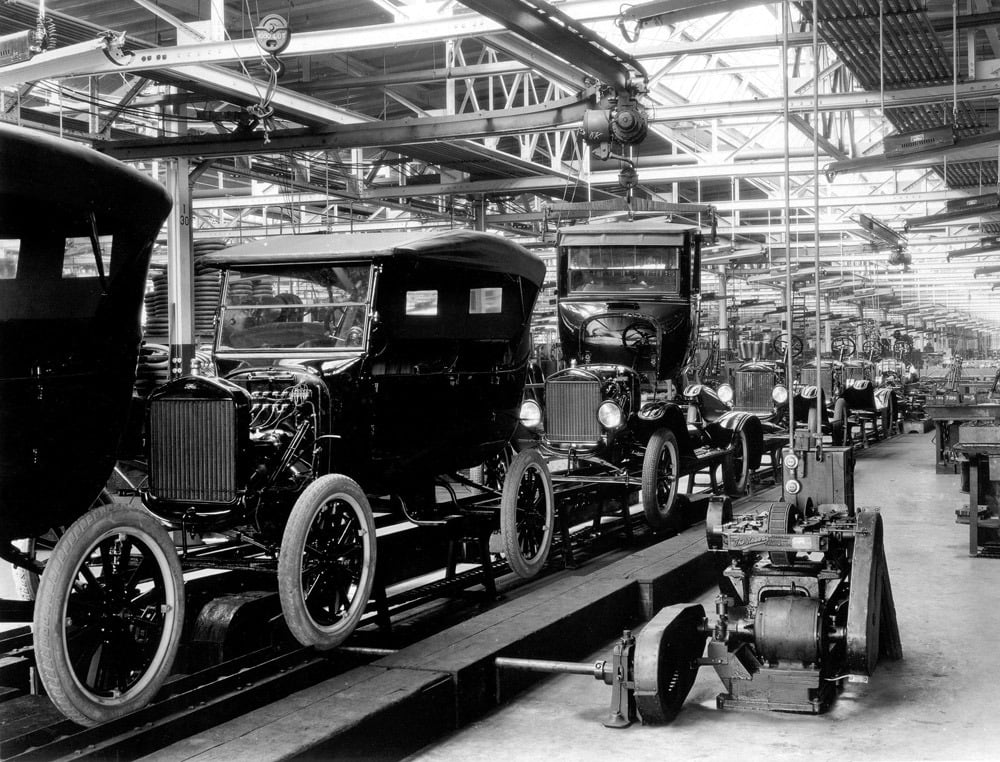 Khung của chiếc xe được một băng tải xích kéo xuống độ cao 150 feet và sau đó 140 công nhân lắp đặt các bộ phận được phân công của họ vào khung xe. Các công nhân khác mang các bộ phận bổ sung đến các dây truyền lắp ráp để đảm bảo mọi thứ luôn sẵn sàng; điều này làm giảm thời gian công nhân rời khỏi trạm của họ để lấy các bộ phận. Dây chuyền lắp ráp đã giảm đáng kể thời gian lắp ráp trên mỗi chiếc xe và tăng tỷ suất lợi nhuận.