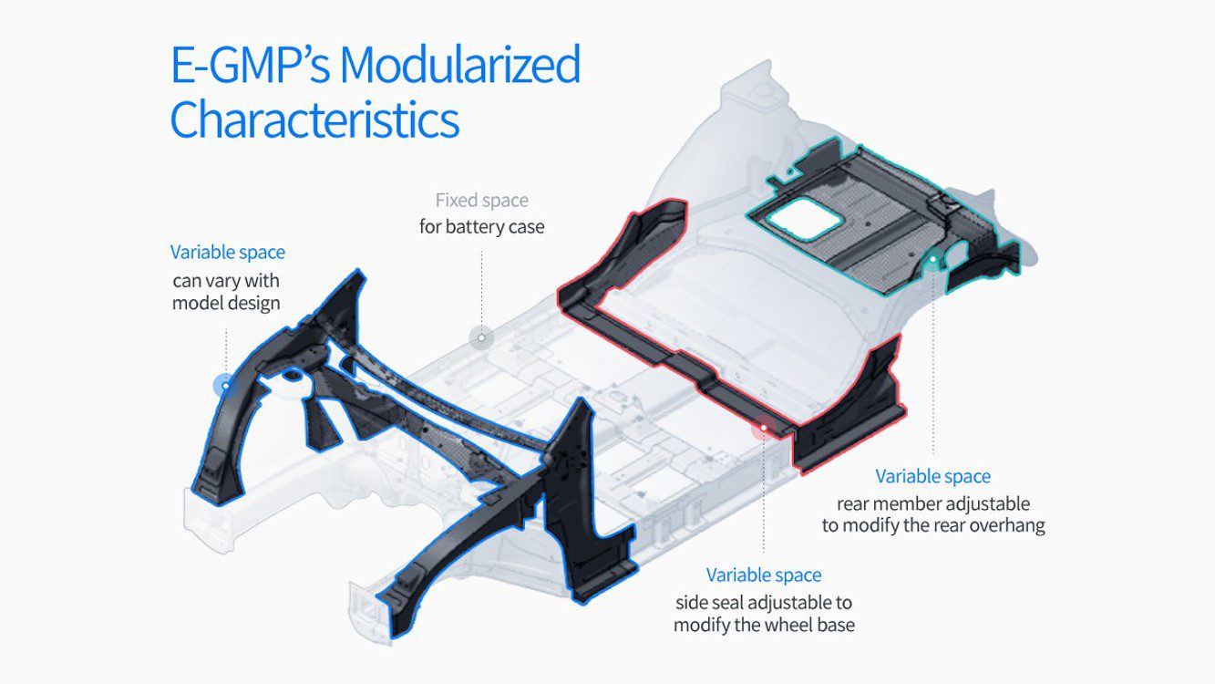 Nền tảng này hỗ trợ chiều dài cơ sở trên 3.000 mm (118,1 in). E-GMP hỗ trợ nhiều kích thước và cấu hình xe khác nhau, bao gồm phân khúc C, phân khúc E, CUV, sedan và SUV, bao gồm cả SUV ba hàng ghế với bảy chỗ ngồi. Albert Biermann tuyên bố rằng “những chiếc xe điện [phái sinh] hiện có trên nền tảng ICEV sẽ có một số mở rộng thành các phân đoạn nhỏ hơn”, điều này được làm rõ có nghĩa là những chiếc xe điện nhỏ hơn sẽ tiếp tục sử dụng nền tảng dẫn động cầu trước. Hệ thống treo sau sử dụng kết cấu năm liên kết. Trục dẫn động tích hợp được sử dụng, trong đó trục dẫn động và ổ trục bánh xe là một khối duy nhất; điều này làm giảm số lượng các bộ phận và tăng độ cứng vững.
