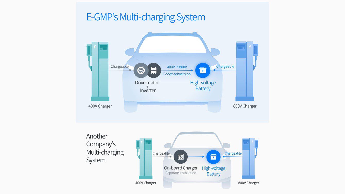 Cơ sở hạ tầng sạc nhanh DC hiện tại (tính đến năm 2022) có công suất và điện áp là 50–350 kW và 400-920 V. Thiết bị điện tử E-GMP hỗ trợ điện áp của cả hệ thống sạc 400 V và 800 V và cung cấp khả năng sạc hai chiều (V2L (110/230 V và lên đến 3,7 kW), V2V và V2G). Nền tảng này sử dụng động cơ/bộ biến tần của xe để chuyển đổi dòng điện DC đầu vào ở mức 400 V thành 800 V.
