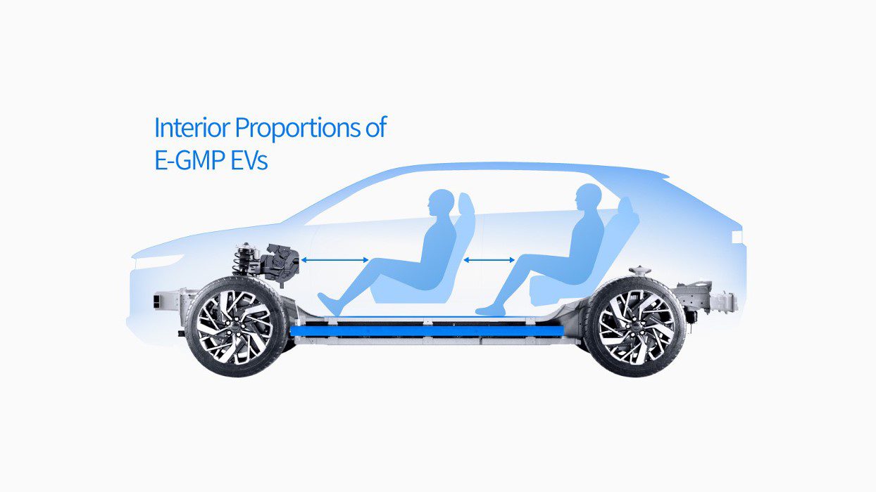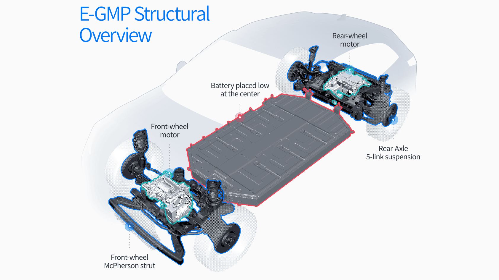 Nền tảng E-GMP là kiến ​​trúc 800 V với chiều dài cơ sở có thể mở rộng và hỗ trợ pin từ nhiều nhà sản xuất. Động cơ, bộ biến tần và hộp số được tích hợp vào một bộ truyền động duy nhất (Powertrain unit).