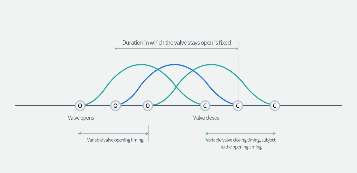 Giải thích cơ chế theo chu trình bốn kỳ: trong quá trình lái xe bình thường, sau hành trình nạp, van nạp vẫn mở tốt cho đến giai đoạn giữa/cuối của hành trình nén, giải phóng không khí thừa và chỉ sử dụng một lượng cần thiết cho quá trình đốt cháy—giúp giảm thiểu tổn thất nén của piston. Trong quá trình tăng tốc, sau hành trình nạp, van nạp sẽ đóng ngay lập tức để tối đa hóa lượng khí nạp, tăng công suất do quá trình đốt cháy tạo ra. Khi làm như vậy, động cơ cho thấy công suất tăng thêm 4% và khả năng tiết kiệm nhiên liệu tăng 5% so với động cơ tương đương không có CVVD. Và do thời điểm đóng van tối ưu sau khi khởi động động cơ sẽ kích hoạt bộ xúc tác sớm hơn nên lượng khí thải cũng giảm hơn 12%.