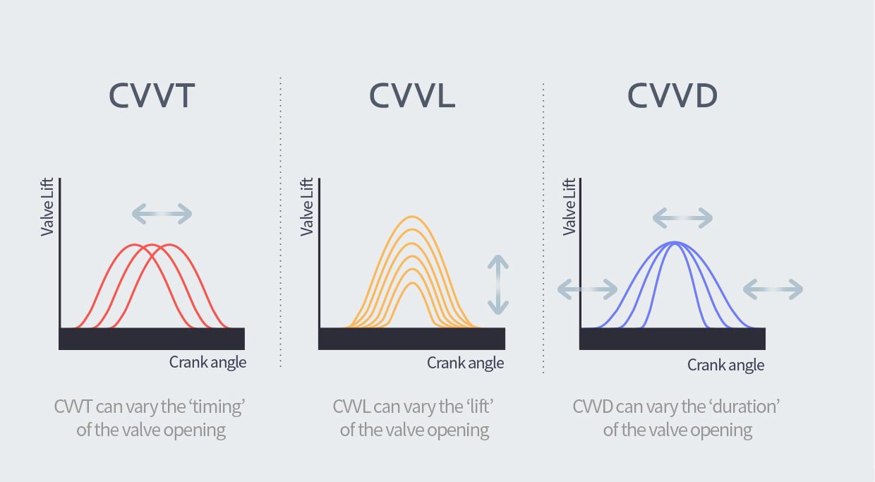 CVVD là câu trả lời của Hyundai cho tình thế khó xử này. Không thay đổi hình dạng của cam, Hyundai đã tận dụng sự phân kỳ thời gian làm nguồn cảm hứng cho giải pháp. Nói một cách đơn giản, theo sơ đồ CVVD, tốc độ của cam đi qua van xác định thời gian van mở. Cam chuyển động chậm giữ cho van mở trong thời gian dài hơn, trong khi cam chuyển động nhanh chỉ giữ cho van mở trong thời gian ngắn.