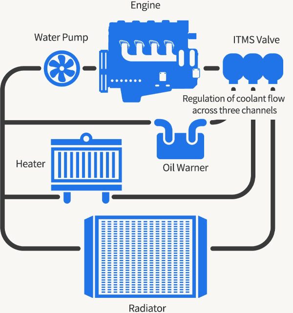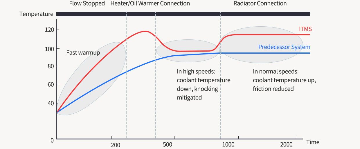 Tuy nhiên, ITMS không chỉ có nhiệm vụ điều chỉnh nhiệt độ động cơ; như đã được thiết lập, nó cũng có thể điều chỉnh dòng chất làm mát đến bộ sưởi tùy theo điều kiện lái xe và ý định của người lái, cải thiện hiệu suất cũng như hiệu quả của hệ thống sưởi và điều hòa không khí.