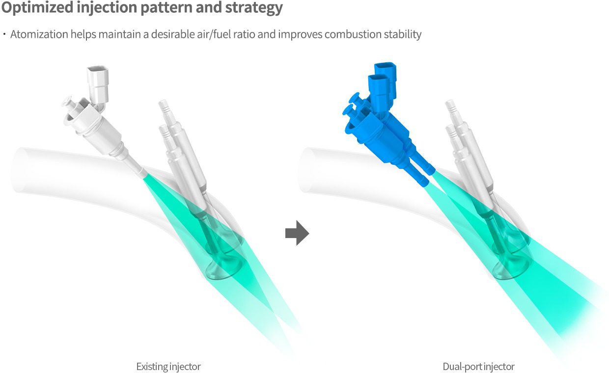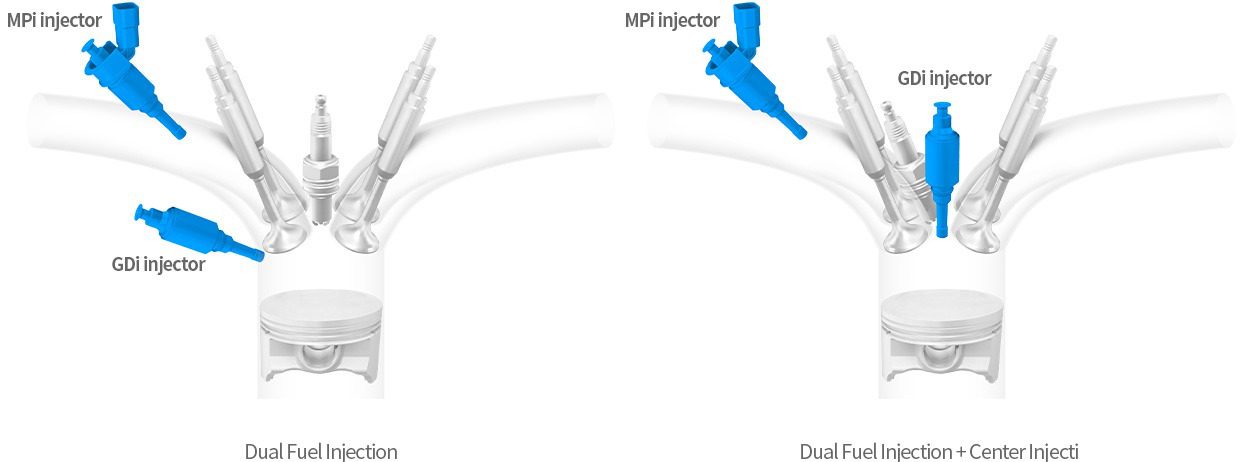 Hệ thống phun nhiên liệu kép mới của Hyundai đi kèm với hai kim phun, một GDi và một MPi cho mỗi xi-lanh, tận dụng ưu điểm của cả hai loại kim phun. Đối với việc lái xe hàng ngày ở tốc độ thấp đến trung bình, hệ thống sử dụng kim phun MPi; để lái xe tốc độ cao trên đường cao tốc hoặc đường cao tốc, hệ thống sử dụng kim phun GDi. Việc tối ưu hóa kiểu phun nhiên liệu phù hợp với các điều kiện lái xe đã dẫn đến sự cải thiện cả về hiệu suất và khả năng tiết kiệm nhiên liệu.