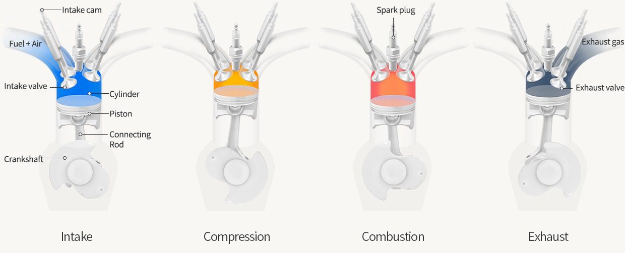 Các pít-tông và van tương tác với nhau, theo một quy trình mà động cơ hít vào không khí, nén nó, làm cho nó cháy và thải ra khí thải. Trong cái gọi là chu trình bốn thì (nạp, nén, nổ, xả), các van—cả van nạp và van xả—đóng vai trò là cửa cho không khí vào và ra.