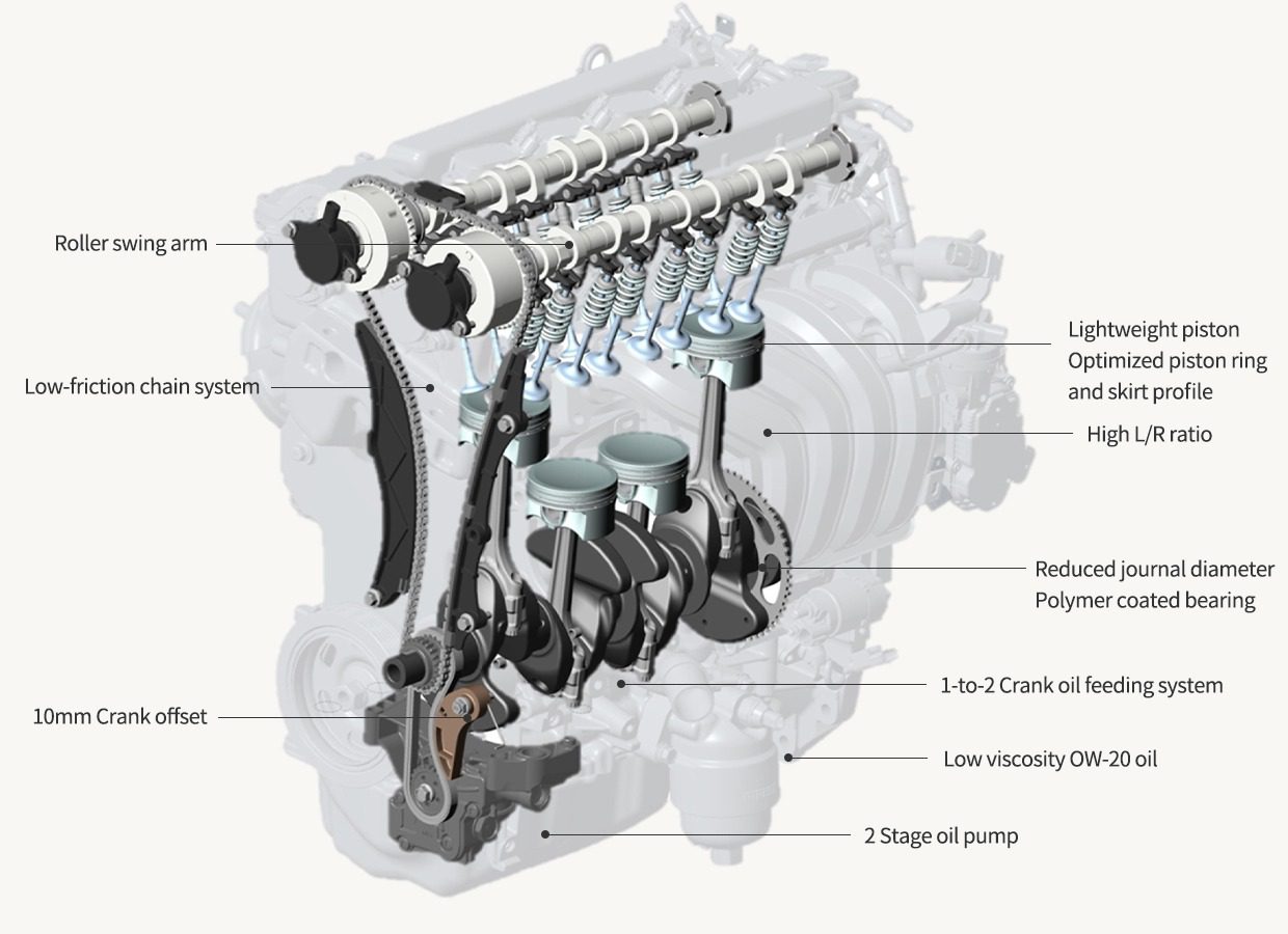 Do đó, việc tối đa hóa khả năng tiết kiệm nhiên liệu của động cơ đòi hỏi phải có công nghệ giảm ma sát. Hệ thống chuyển động tối ưu hóa ma sát (FOMS) của Hyundai sử dụng công nghệ phủ và vật liệu nhẹ tiên tiến để giảm đáng kể hệ số ma sát. Với FOMS, ma sát trong động cơ đã giảm 34%, giúp giảm thiểu thất thoát năng lượng và cải thiện khả năng tiết kiệm nhiên liệu.