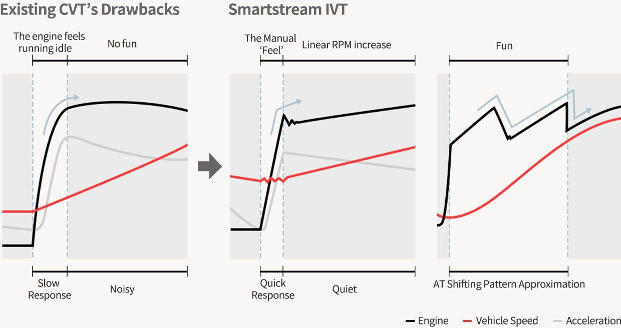 Smartstream IVT của Hyundai là thế hệ CVT tiếp theo đã tối đa hóa lợi thế của nó và giải quyết các vấn đề về độ bền cũng như ‘cảm giác’ gây khó chịu cho phiên bản gốc. Nó gần giống với cảm giác chuyển số của những chiếc AT thông thường bằng cách tạo ra các kiểu chuyển số ảo đáp ứng ý định của người lái.