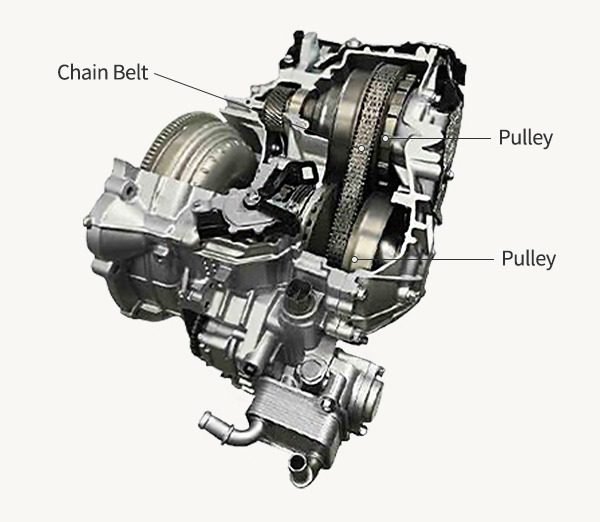 Hộp số biến thiên liên tục (CVT) có cấu trúc trong đó hai puly nối với trục ra của động cơ và trục dẫn động được liên kết thông qua một dây đai. Đường kính của hai puly thay đổi, do đó làm thay đổi tỷ số truyền. CVT có khả năng thiết lập RPM động cơ tối ưu để đạt được công suất và hiệu suất tối đa.