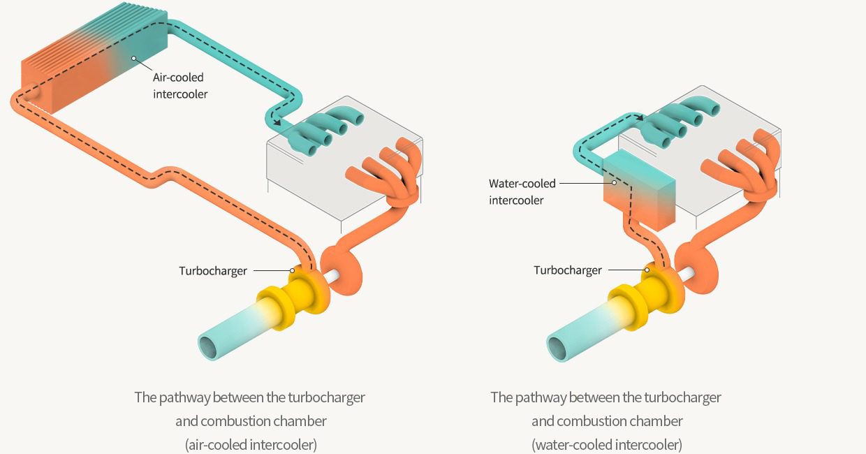Bộ làm mát Intercooler có loại làm mát bằng nước và làm mát bằng không khí. Nhiều động cơ sử dụng loại thứ hai, hoạt động bằng cách đưa khí nén đến quạt làm mát ở phía trước ô tô và làm mát bằng gió chạy bên ngoài. Nhưng điều này làm cho khí nén di chuyển một quãng đường dài, gây ra cái gọi là ‘độ trễ turbo’, độ trễ giữa thời điểm người lái nhấn bàn đạp ga và thời điểm bắt đầu tăng tốc thực sự. Và còn có giới hạn cơ bản của việc làm mát bằng không khí—nó không hiệu quả bằng làm mát bằng nước.