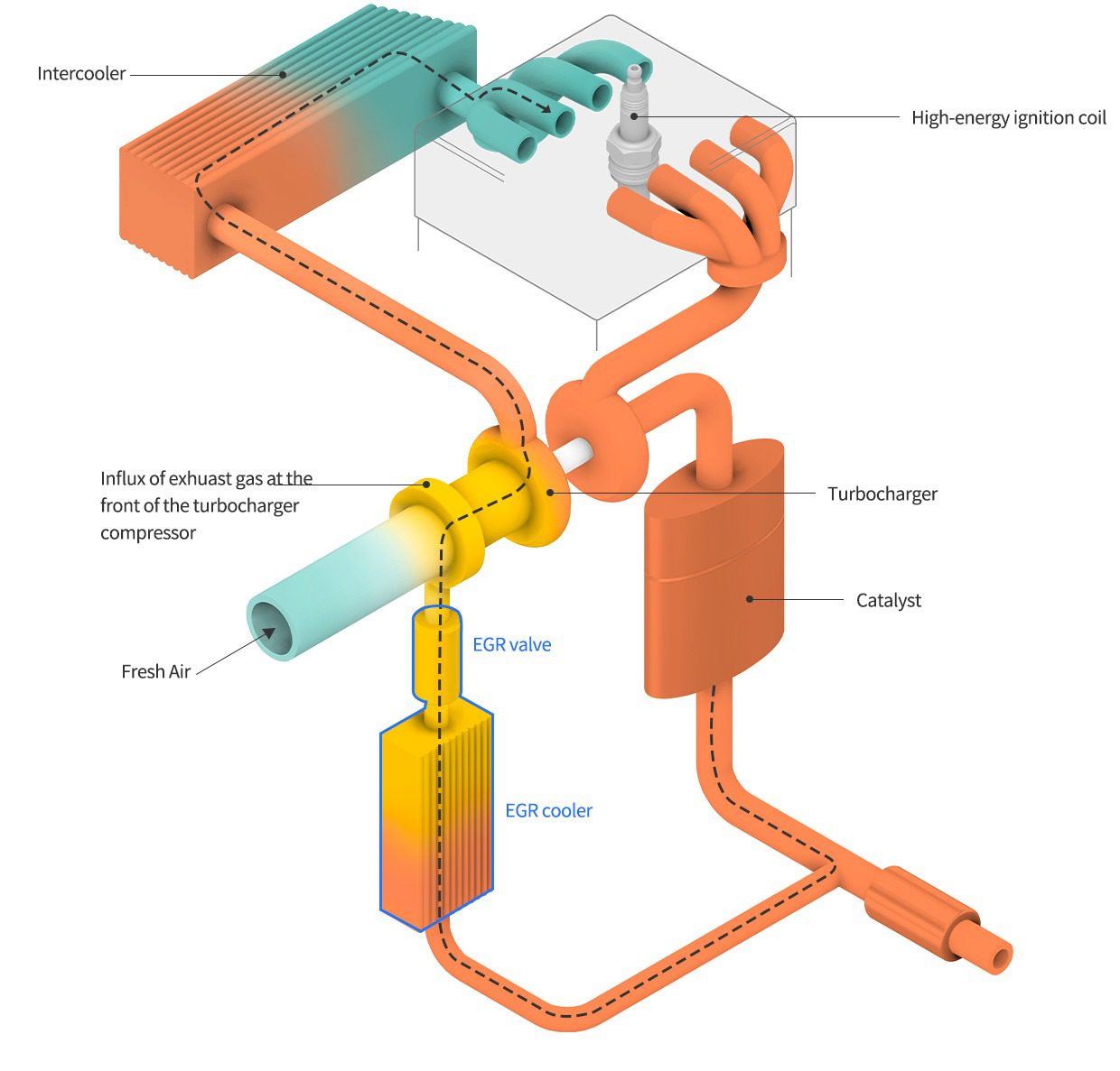 Hệ thống HIE-EGR của Tập đoàn ô tô Hyundai được điều chỉnh phù hợp với hai loại động cơ, thông thường và turbo. Động cơ thông thường đi kèm với Hệ thống EGR làm mát, trong khi động cơ turbo sử dụng Hệ thống EGR áp suất thấp (LP), trộn lẫn khí thải đã đi qua chất xúc tác với không khí trong lành ở đầu phía trước của máy nén tăng áp. Sự sắp xếp này tập trung vào việc giảm tiếng gõ của động cơ cũng như giảm nhiệt độ khí thải nhằm tiết kiệm nhiên liệu.