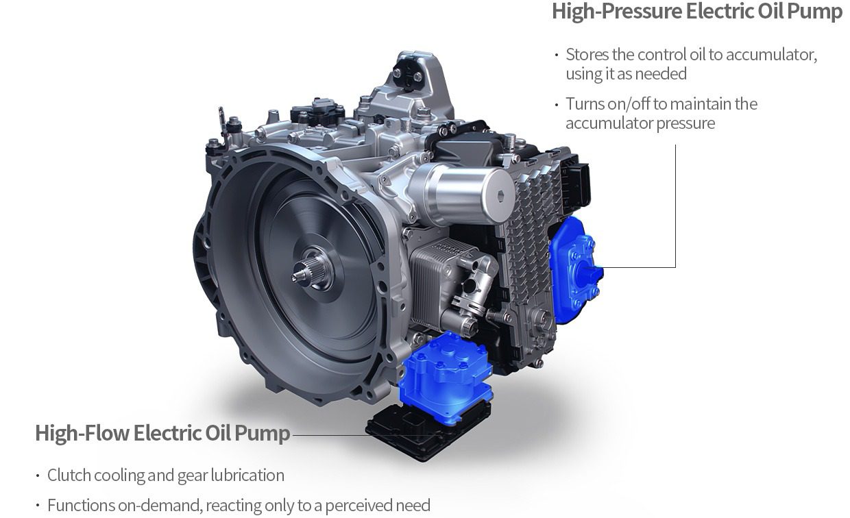 HF-EOP hoạt động độc lập với RPM của động cơ và bơm dầu làm mát qua các bộ ly hợp được làm nóng bằng cách chuyển số liên tục. Tuy nhiên, không chỉ làm mát, dầu còn có tác dụng bôi trơn các bánh răng và đảm bảo hoạt động cơ học trơn tru của nó. HP-EOP hoạt động theo sơ đồ theo yêu cầu (chỉ kích hoạt khi có nhu cầu) và duy trì mức áp suất thủy lực trong bộ tích lũy, cần thiết để điều khiển hộp số, trong phạm vi chấp nhận được. Với hai EOP này, Smartstream Wet 8DCT đã giảm đáng kể hoạt động bơm dầu không cần thiết và do đó tăng khả năng tiết kiệm nhiên liệu.