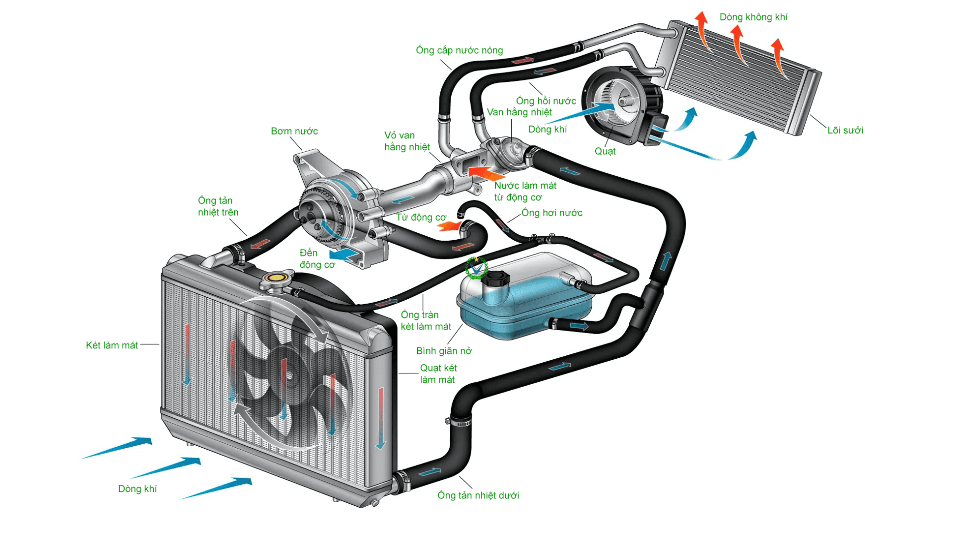 Trong một hệ thống làm mát ô tô điển hình, bạn sẽ tìm thấy ít nhất 4 ống chính. Đầu tiên, ống tản nhiệt phía trên dẫn trực tiếp từ vỏ van hằng nhiệt (trên cổ góp nạp hoặc đầu xi lanh) vào phía trên của két làm mát. Gắn vào đáy của bộ tản nhiệt là một ống tản nhiệt phía dưới. Được hút bởi máy bơm nước của động cơ, chất làm mát được hút đã tỏa ra hầu hết nhiệt khi nó đi qua bộ tản nhiệt. Ống tản nhiệt dưới và ống tản nhiệt phía trên là ống lớn nhất trong số các ống của hệ thống làm mát, và cả hai đều được gắn vào mặt trước của khối động cơ.
