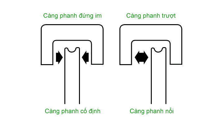 Càng phanh có thể chứa nhiều piston khác nhau và đi kèm với thiết kế ngàm “cố định” hoặc “nổi”. Càng phanh loại cố định có các pít-tông ở CẢ HAI bên của đĩa phanh. Khi phanh thì càng phanh loại này đứng yên vì chúng được cố định với giá trục bánh xe ở vị trí trên tâm của đĩa phanh. Ngược lại, càng phanh nổi (di động), với một piston hoặc các piston chỉ ở một bên, càng sẽ trượt từ bên này sang bên kia để (các) piston có thể tạo áp lực đệm từ cả hai hướng.