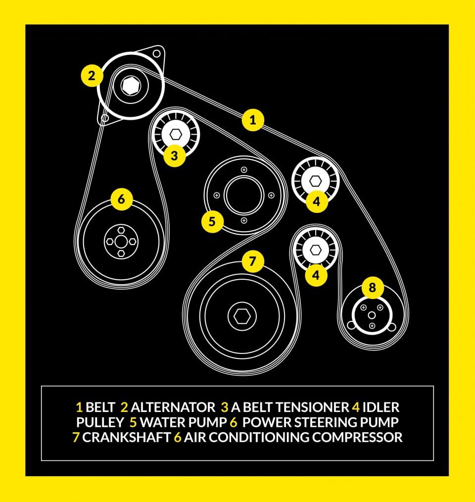 Dây đai truyền động phụ trợ còn được gọi là dây curoa, nó dẫn động chạy tất cả các hệ thống phụ ở phía trước động cơ. Không nên nhầm lẫn nó với đai trục cam (timing )phục vụ một mục đích hoàn toàn khác.