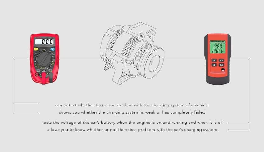 Máy kiểm tra ắc quy và hệ thống sạc có thể phát hiện xem có sự cố với hệ thống sạc của xe hay không. Sử dụng công cụ này cho bạn biết liệu hệ thống sạc có yếu hay đã bị lỗi hoàn toàn hay không. Nó cũng có thể xác định xem bất kỳ điốt nào điều khiển máy phát điện bị lỗi hoặc nếu tất cả đều ổn.