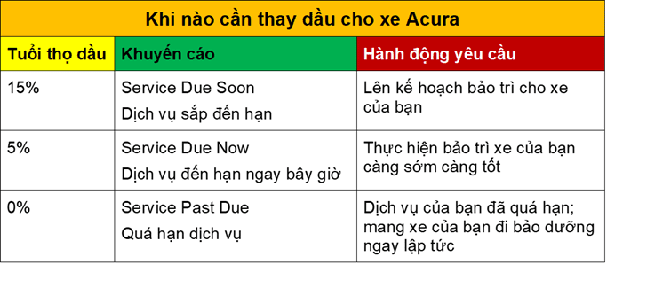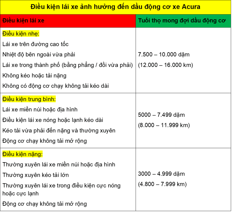 Một số thói quen lái xe có thể ảnh hưởng đến tuổi thọ của dầu động cơ, cũng như các điều kiện lái xe như nhiệt độ và địa hình lái xe. Điều kiện lái xe và nhiệt độ nhẹ hơn, vừa phải hơn sẽ ít yêu cầu thay dầu và bảo dưỡng thường xuyên hơn, trong khi các điều kiện lái xe khắc nghiệt hơn sẽ yêu cầu thay dầu và bảo dưỡng thường xuyên hơn. Hãy đọc bảng dưới đây để biết cách hệ thống Nhắc nhở bảo trì của Acura xác định tuổi thọ của dầu: