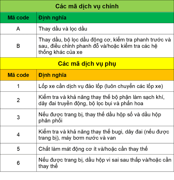Khi đèn báo dịch vụ xuất hiện trên bảng điều khiển của bạn, nó sẽ xuất hiện cùng với mã dịch vụ và mã phụ cho biết một số biện pháp bảo dưỡng được khuyến nghị nhất định có thể ảnh hưởng đến hoạt động của xe của bạn, cũng như các bước phòng ngừa cần thiết để kiểm tra một số bộ phận để xác định chất lượng của chúng trong quá trình kiểm tra . Khi bạn thấy các mã được hiển thị trên bảng điều khiển của mình, bạn sẽ thấy một mã và có thể là một hoặc bất kỳ tổ hợp mã phụ nào (tức là A1 hoặc B1235). Dưới đây là danh sách các mã, mã phụ và ý nghĩa của chúng: