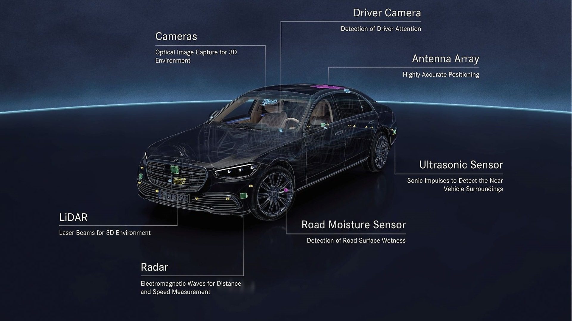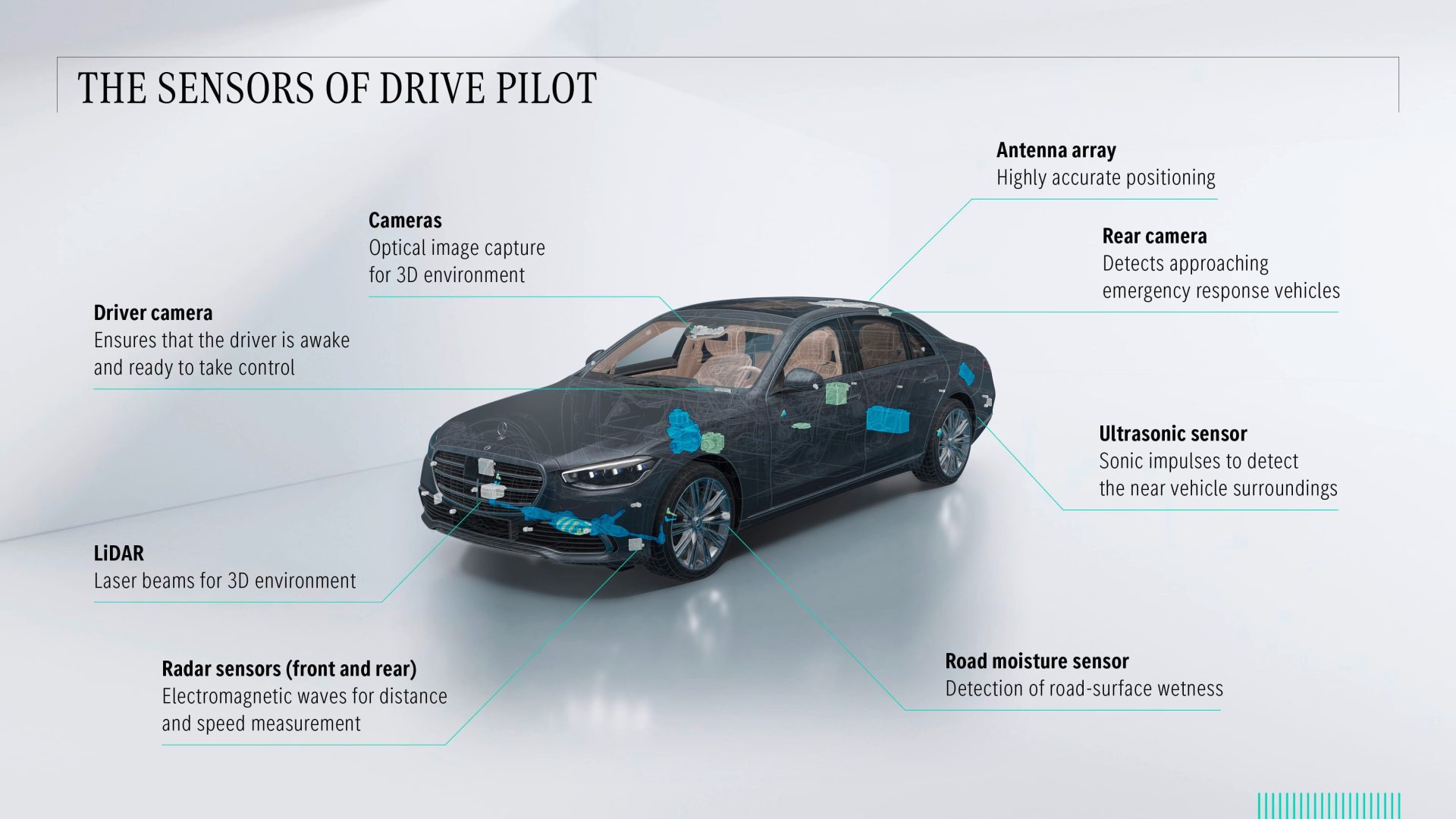 - Các cảm biến phụ: DRIVE PILOT còn được trang bị micro để thu âm thanh từ môi trường (nhằm nghe tiếng còi của xe cảnh sát, cứu hỏa, cứu thương) và thậm chí cả một cảm biến độ ẩm ở hốc bánh xe để phát hiện mặt đường trơn trượt.
