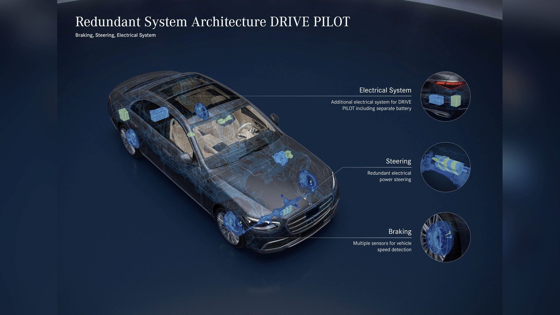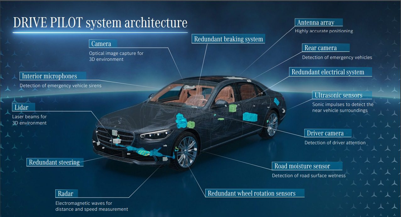Để có thể “chịu trận” về mặt pháp lý, Mercedes-Benz đã trang bị cho DRIVE PILOT một hệ thống phần cứng và phần mềm với triết lý dự phòng ở mức độ rất cao, gần như tương đương với ngành hàng không.