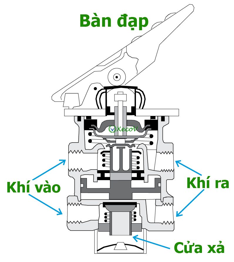 Trong sơ đồ hệ thống phanh khí nén ở trên, không khí có áp suất cao được biểu thị màu xanh lam đậm trong đường ống và bình chứa.