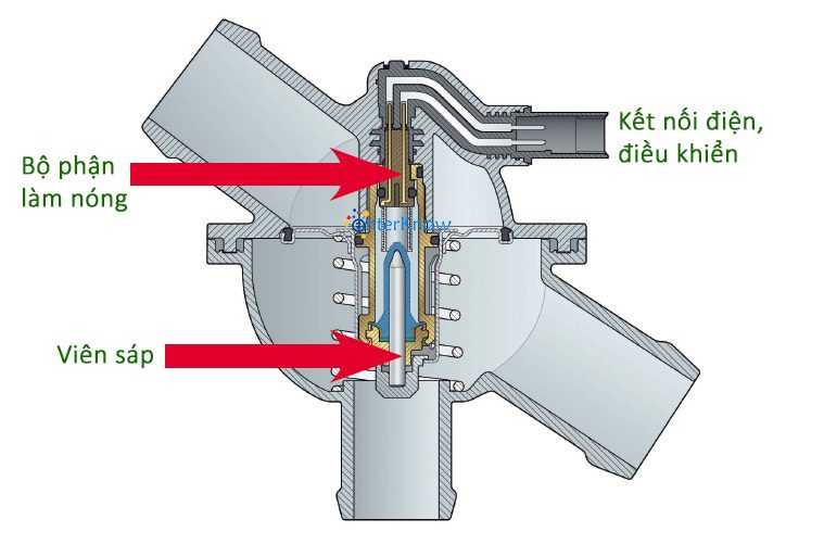 Một thanh nối với van sẽ ép vào lớp sáp này. Khi sáp tan chảy, nó giãn nở đáng kể và đẩy thanh ra khỏi xi lanh, làm mở van.