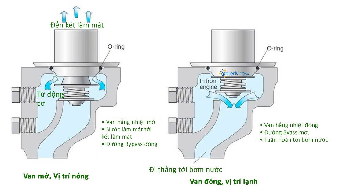 Khi van bypass mở, nước làm mát sẽ tuần hoàn trong một mạch kín ở động cơ. Khi nhiệt độ nước làm mát động cơ tăng lên, van bypass bắt đầu đóng và nước làm mát được dẫn về phía két làm mát. Động cơ sẽ nhanh chóng bị quá nóng nếu nước làm mát không được chuyển sang két làm mát để làm mát.